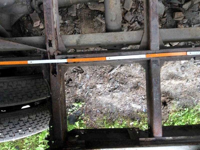 Das Knotenblech auf der linken Seite muß noch entfernt werden, aber auf dem Bild erkennt man deutlich den Verrottungsgrad. Die neuen Querträger liegen schon bereit. 3 der oben spezifizierten Träger mit je zwei Metern Länge für fünfundfünfzig Euro frei Haus ist ein guter Preis.