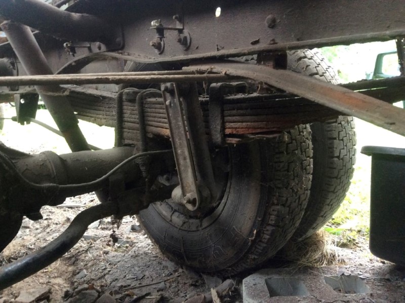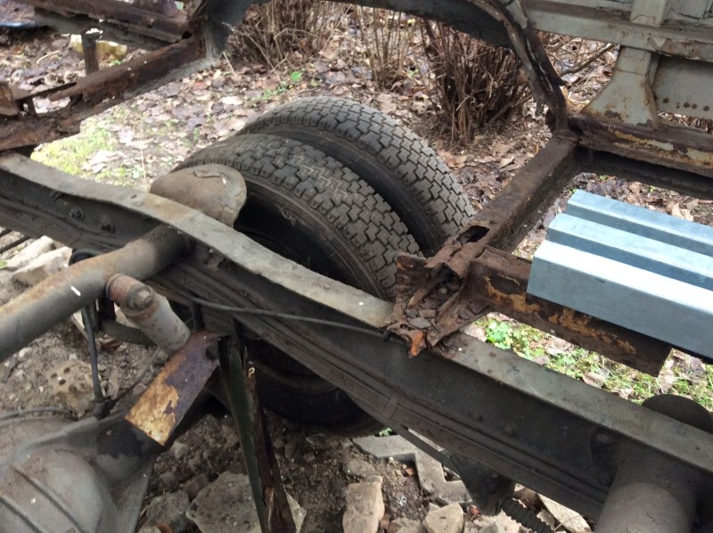Den Rest der Außseite ist schon mal von Kederschienen, druckknopfartigen Verschlüssen, Durchführungen und sonstigen Abdeckungen befreit. Ein Blick auf die Blattfedern der Hinterachse zeigt, dass ich wohl besser neue federn eingebaut werden. Die gibt es noch! Aber immer mit der Ruhe - eins nch dem anderen! Man sollte nicht zu schnell urteilen um nicht unnötig viel Geld in den Sand zu setzen, falls doch noch unkalkulierbare Problem auftauchen.