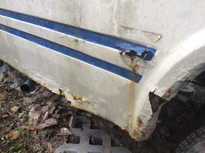 Die Seitenbleche der Karosserie sind schon ganz schön bröselig geworden. Metall das eher an Presspappe erinnert und an vielen Stellen zwischen zwei Fingern zermahlen werden kann oder nur noch durch die Farbe zusammengehalten wird. Was ist mit den tragenden Teilen darunter? Von welchen Haltepunkten hatte der TÜV gesprochen?