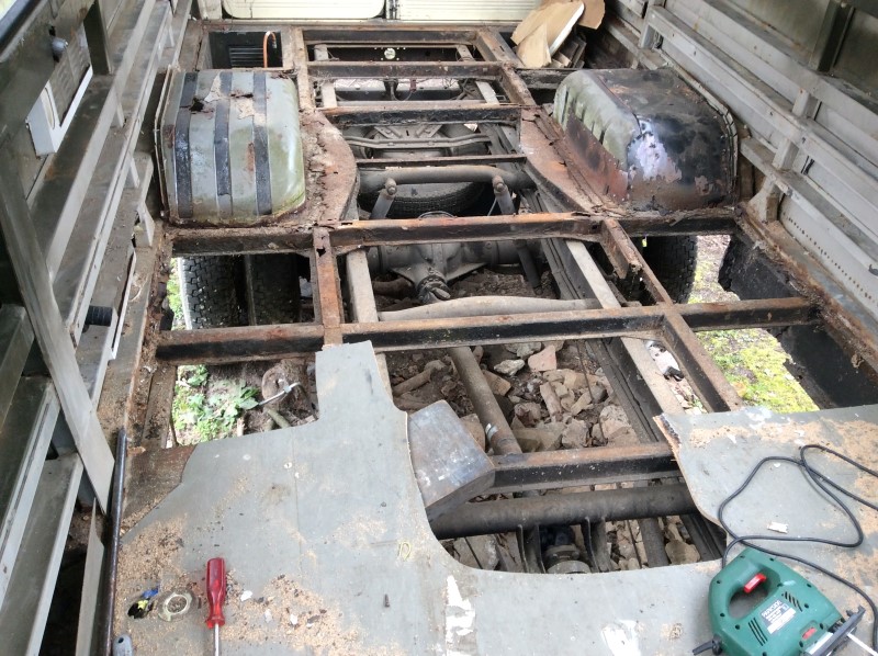 Der Boden muss auch raus. Wenn ich die verdamten Haltepunkte von denen der TÜV sprach reparieren will, dann nur von oben. Da habe ich ein Dach über dem Kopf und kann im Regen arbeiten ohne rücklings auf dem Boden zu liegen. So fällt mir weniger Rost in die Augen und beim Schweißen kann nichts abbrennen. Der Holzboden ist auch schon oll und wenn ich einen neuene reinbaue, dann so dass man Teile von oben herausnehmen kann (zur Kontrolle und Instandhaltung). Ich hole die Stichsäge und fange an...