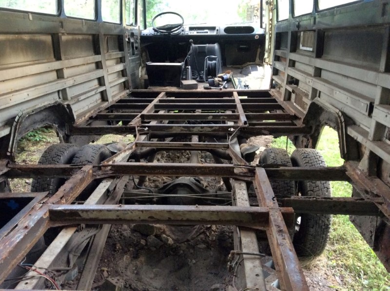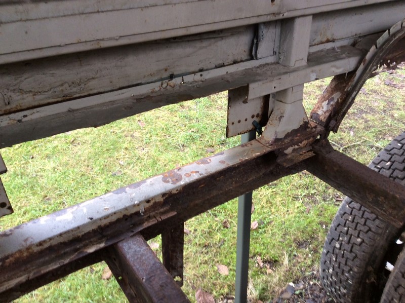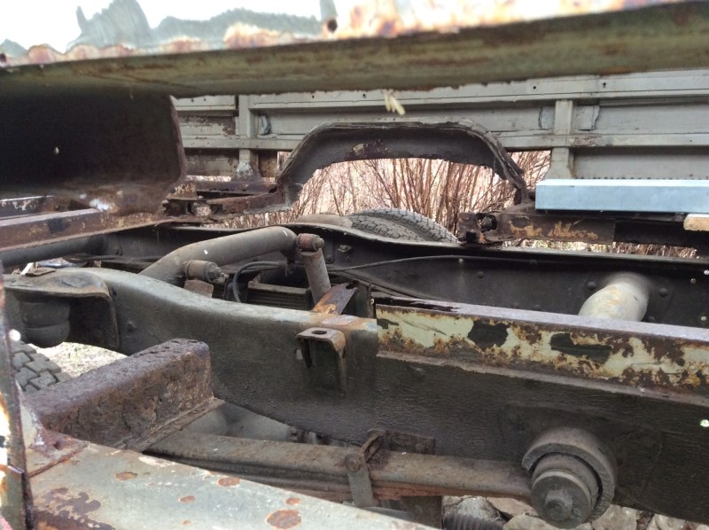 Den Rest der Außseite ist schon mal von Kederschienen, druckknopfartigen Verschlüssen, Durchführungen und sonstigen Abdeckungen befreit. Ein Blick auf die Blattfedern der Hinterachse zeigt, dass ich wohl besser neue federn eingebaut werden. Die gibt es noch! Aber immer mit der Ruhe - eins nch dem anderen! Man sollte nicht zu schnell urteilen um nicht unnötig viel Geld in den Sand zu setzen, falls doch noch unkalkulierbare Problem auftauchen.