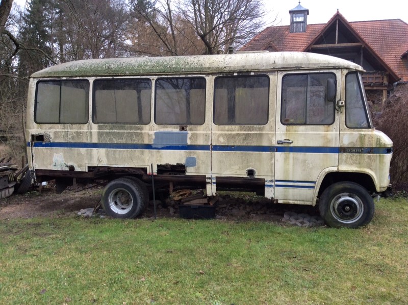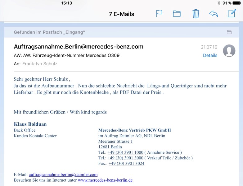 Die Recherchen bei der Mercedes-Benz AG sind fruchtbar. Antwort habe ich keine erwartet, weil das Anfrageportal nur für Werkstätten gedacht ist. Das Anfrageformular ist schnell ausgefüllt und, entgegen meiner Erwartungen, kontaktiert mich sehr schnell ein Ersatzteilprofi der Mercedes-Benz AG. Nach kurzem hin und her wegen fehlender Angaben zu Fahrgestellnummer und Aufbaunummer kommt dann die ernüchternde Nachricht: es gibt keine Rahmenprofile mehr als Ersatzteile. Aber man kann noch die Knotenbleche kaufen, allerdings zu einem hohen Preis. "Hut ab, Mercedes-Benz!" für diesen Servive. Man könnte die benötigten Rahmenstücke von einer Metallbazfirma biegen lassen oder ein gebrauchtes Rahmenstück einschweissen.
