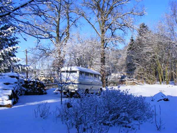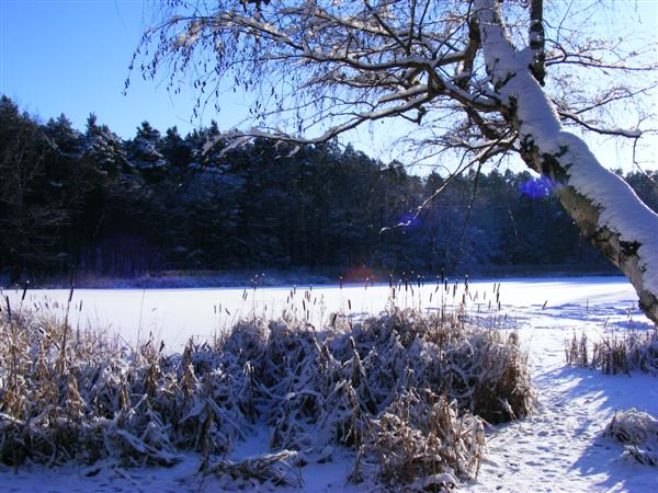 Die Tage sind überwiegend sonnig. Trockene Luft und wolkenloser Himmel. Der Benz ist komplett eingefroren und lässt sich für Tage nicht mehr starten. Zum Einkaufen für das Nötigste geht es 10 Kilometer zu Fuss durch den verschneiten und lichten Birkenwald. Ein bischen fühlt man sich dabei wie in Sibirien. Die Schuhe knirschen im Schnee und nicht selten kreuzen ein paar Rehe den Weg. Sonst nur Sonne, Schnee und Stille - das hat was.