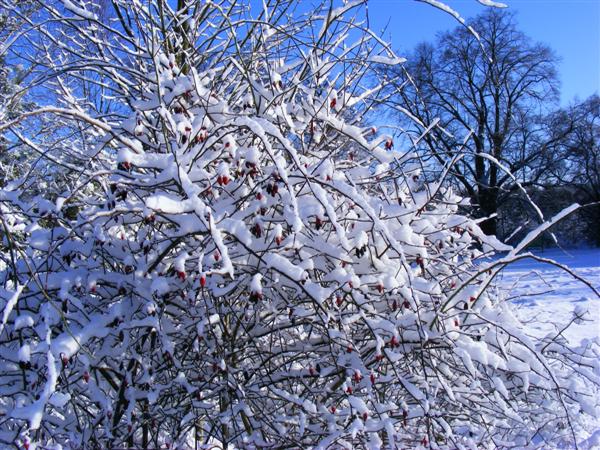 Der Blick in den Garten mit dem eingefrorenen Benz...