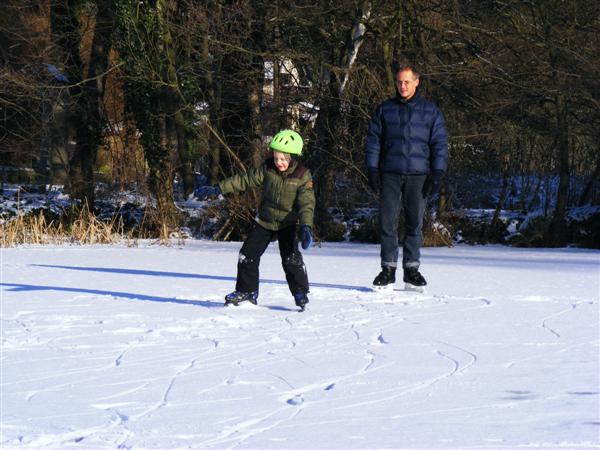 Die Eisdecke auf den Seen ist mittlerweile 17 Zentimeter stark, wahrscheinlich könnte man auch mit dem Benz drüberfahren - wenn er denn laufen würde. Also testen wir unsere neuen Schlittschuhe. Elias steht das erste Mal auf diesen Dingern, anfangs sehr wackelig aber schon am zweiten Tag hat er die Sache raus und es macht ihm viel Spass.