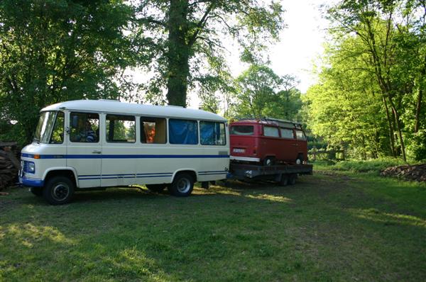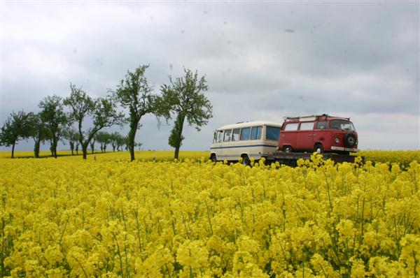 Vor einem Jahr waren wir hier und haben den Bulli in einer Scheune abgestellt. Jetzt geht es mit dem Bulli auf dem Hänger durch die gleichen blühenden Rapsfelder zurück nach Berlin. Mit über 2 Tonnen etwas überladen für die Anhängerkupplung von Benzi...