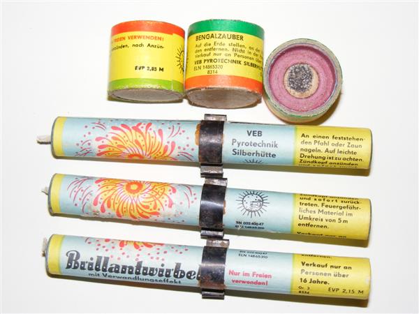Gelbe Säcke haben wir diesmal wieder nicht bekommen, dafür schenkte uns dieser nette Kaufmann aus alten NVA-Restbeständen 6 Feuerwerkskörper. 3 mal Bengalzauber und 3 mal Brilliantwirbel. Wahnsinn - mindestens 20 Jahre alt - und damals zusammen für glatte 15 Mark gehandelt.