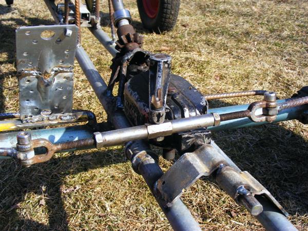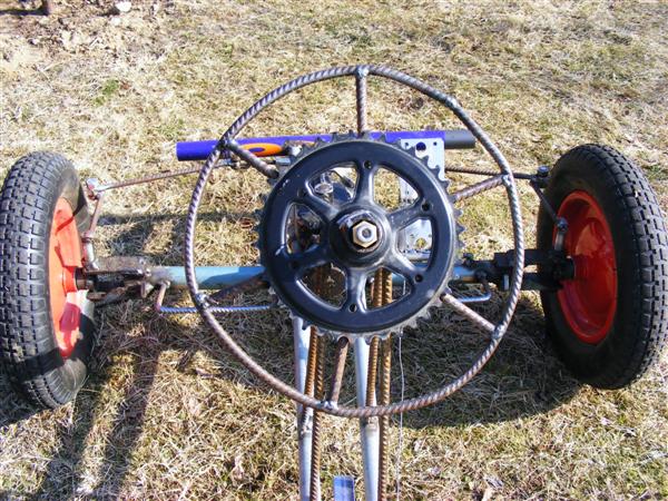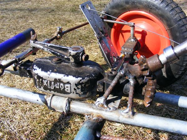 Als Lenkgetriebe dient eine "Borfix" Handbohrmaschine, deren Hersteller ohne das nötige "h" Insolvenz anmelden musste. Zum Ausgleich der falschen Lenkeinschlagrichtung (das wäre fast ein fataler Konstruktionsfehler geworden) dahinter die beiden Hilfszahnräder, die von einem alten Opelwagenheber stammen...
