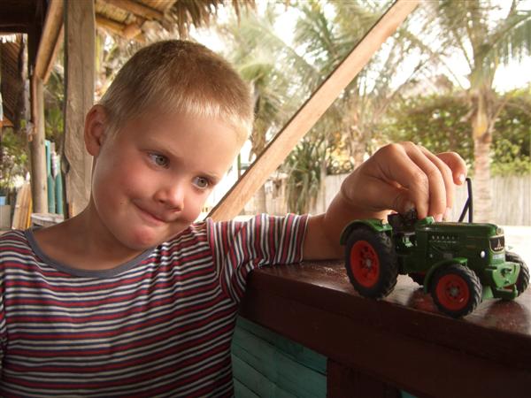 Ein Tag vor Weihnachten war Elias dann ausserordentlich lieb. Und am 24.12. ist dann tatsächlich der Weihnachtsmann gekommen. Früh morgens - wir haben noch geschlafen - hat er die Geschenke in den Bus gelegt. Elias war ausser sich und hat sich riesig über seinen neuen Traktor gefreut. An dieser Stelle noch einmal tausend Dank für all die lieben Geschenke und Weihnachtsgrüsse, die uns erreicht haben. Und auch an all die, die dazu beigetragen haben, dass die Geschenke hier angekommen sind.
