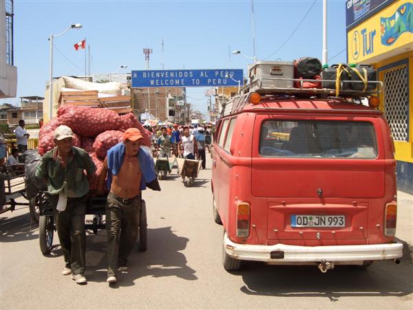 Wir passieren wieder die Grenze nach Peru. Das hektische Treiben auf den Strassen stört uns nicht mehr. Die Grenzformalitäten gehen schnell. Oft wissen die Grenzer mit den deutschen Papieren nichts anzufangen. Bereitwillig tragen sie alles was wir ihnen vorschlagen in die Formulare ein. Wahrscheinlich könnte man den Grenzern hier auch einen Kaufvertrag für eine Waschmaschine als Fahrzeugschein präsentieren. Vielleicht liegt es an der Schulbildung, oder eben nur an der unerträglichen Hitze.