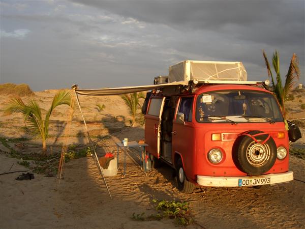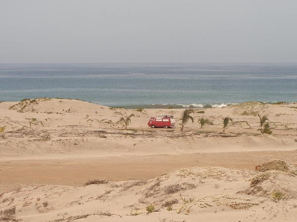 Hier, am nördlichen Dorfrand von Los Organos, stehen wir die nächsten Tage und planen unsere weitere Tour. Der Strand ist fast menschenleer und im nahen Dorf bekommt man alles was man zum Leben braucht. Die Vegetation ist spärlich und man versucht mit hohem Aufwand ein paar Palmen anzupflanzen. Die Sonne knallt erbarmungslos vom Himmel und auch in der Nacht ist es oft sehr heiss im Bus. Unter uns lagert Erdöl und die Bohrinsel im Meer leuchtet im Sonnenuntergang unwirklich rötlich. Pelikane schweben über die Wellen und die Zeit verrinnt ebenso - fast wie im Flug.