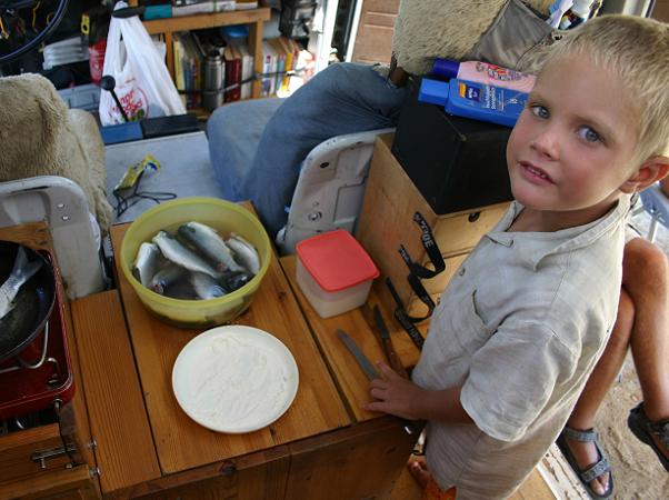 Aber noch schwimmen einem die Fischen fast in die Pfanne. Zwar ungebraten, aber dennoch ohne Angel gelingt uns eines Morgens der Fang von zwei Kilogramm Fisch, die von den Wellen angespühlt wurden. Klasse Sasche: am Strand ausgenommen und direkt in die Pfanne.