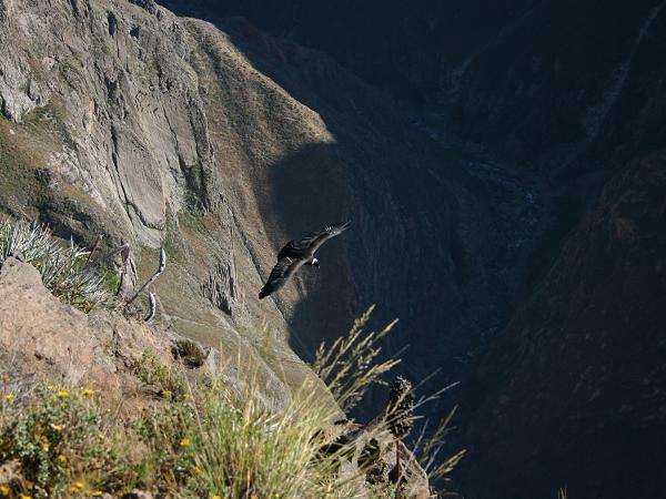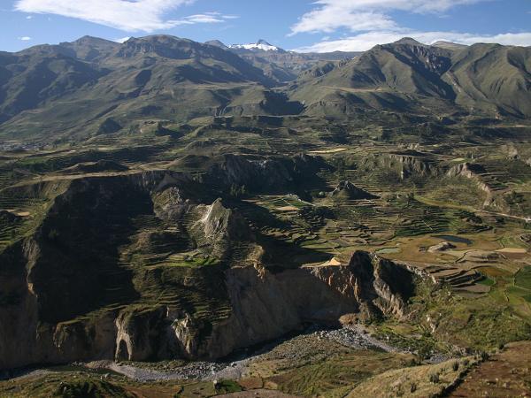 Von hier aus geht es hinab in den Colca-Canyon. Eine der wichtigsten Landwirtschaftsgebiete Perus. Schon zu Zeiten der Inkas wurde auf den terrassierten Hängen Obst und Gemüse angebaut. Die geernteten Erträge wurden mit Lamakarawanen abtransportiert. 1931 wurde eine Flugpiste zur medizinischen Versorgung angelegt (sie dient heute als sehr breiter Strassenabschnitt und wir benutzten sie als Campingplatz). Seit 1975 gibt es eine Strassenverbindung in den Canyon. Der Colca-Canyon ist angeblich der tiefste Canyon der Welt, aber wohl nur, weil von den Spitzen der umgebenden 5000er gemessen wurde. Für uns eher eine Augenwischerei :-)