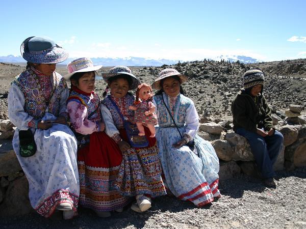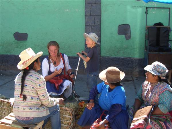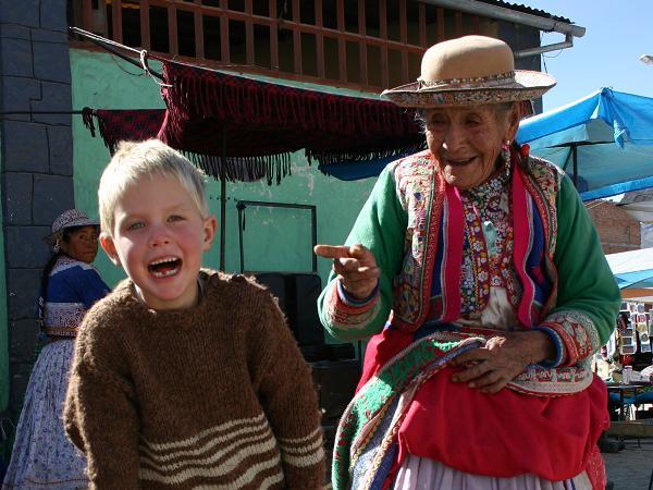 Die Menschen beackern ihre Felder noch per Hand und auch das Korn wird noch per Hand gedroschen. Viele Bewohner sind noch in ihren ursprünglichen Trachten gekleidet. Kunstvoll mit der Nähmaschine bestickte Kleider. Grund genug den Menschen hier einmal eine Tracht aus (wir lügen etwas) Deutschland vorzustellen. Auch wenn es nicht so aussieht - die Menschen hier sind sehr freundlich. Nach kurzer Zeit kennt man uns in Chivay, die mit dem roten Bus und dem blonden Jungen. Kinder sind hier überhaupt sehr willkommen. Ganz anders als in Deutschland haben hier Kinder grundsätzlich freien Eintritt (was wir im Thermalbad genossen) und freie Fahrt in Bussen. Ist ja auch klar, denn Kinder können ja noch kein Geld erwirtschaften, sind aber für eine Gesellschaft unabdingbar wichtig. Sollte Deutschland mal darüber nachdenken...