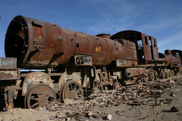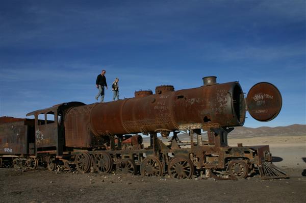 Kurz hinter Potosi endet die Teerstrasse und das Abenteuer beginnt. Auf den ersten 200 Kilometern eine Landschaft wie aus einem Wildwestfilm. Kakteen, bizarre Felsformationen und Canyons. In Pulacayo ist dann auch der Zug, der einst von Butch Cassidy und Sundance Kid überfallen wurde, zu sehen. Allerdings nicht mehr ganz so schön wie damals im Film.