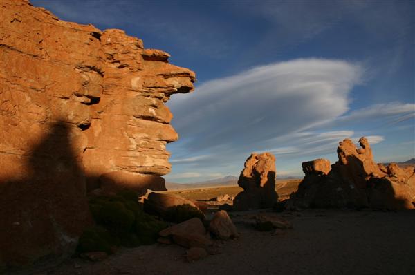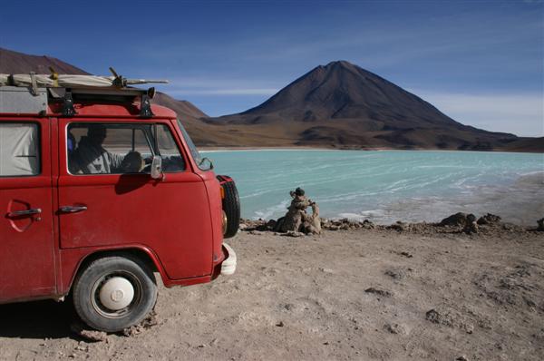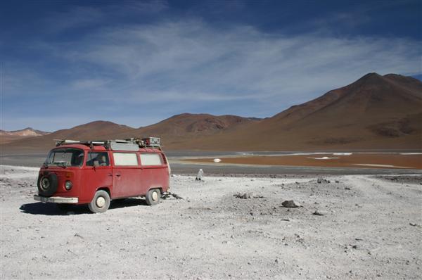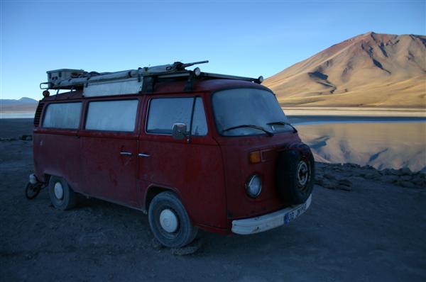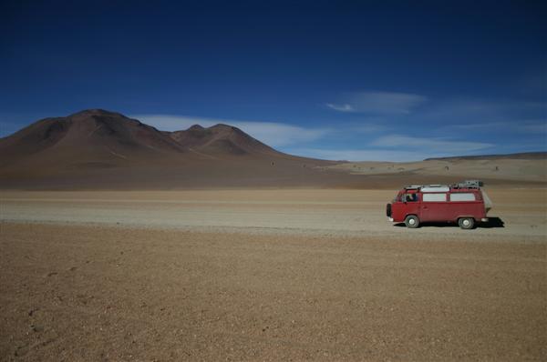 Wir steuern eine Felsformation, vor der sieben Geländewagen stehen, an. Die Insassen mit heruntergefallenen Kinnladen und ausgestreckten Zeigefingern. Nie war es erotischer aus einem VW-Bus zu steigen. Hier wohl das einzige zweiradgetriebene Fahrzeug im Umkreis von etwa 1200 Quadratkilometern. Vor Sonnenuntergang, der schönsten Zeit hier, verlassen uns die Tourgruppen. Wir sind alleine und opfern mehrere dutzend Büsche der bolivianischen Puna für ein akzeptables Lagerfeuer. Noch sind wir nicht am Ziel, aber schon fühlen wir uns siegessicher. Mit den warmen Steinen vom Lagerfeuer im Auto steigt uns der Geruch von Schwarzwälder Schinken in die Nase und wir träumen uns ins Guinnesbuch der Rekorde.