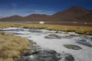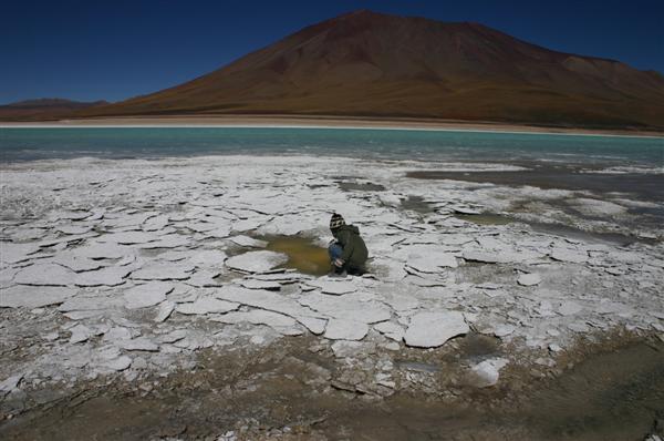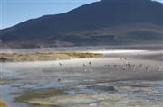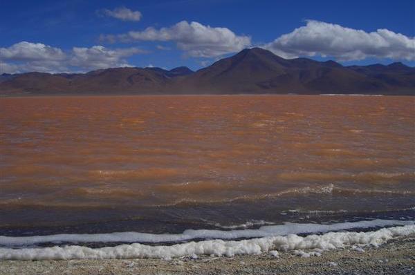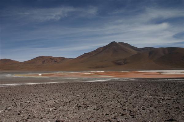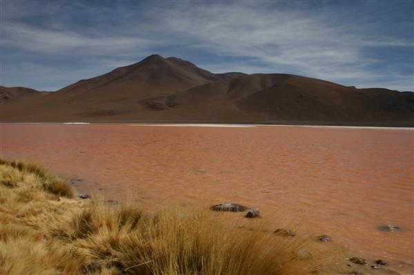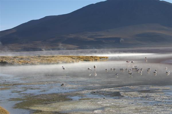 Auf der Rückfahrt nehmen wir erst einmal ein entspannendes Bad in den 40 Grad heissen Thermas de Chalviri. Weiter geht es in Richtung Laguna Colorado. Vorbei an Geysirfeldern, die aber abgeschaltet zu sein scheinen. Lohnt sich nicht, den Dampf sieht man nur im Morgengrauen bei eben -15 Grad. Umso schöner dagegen die Laguna Colorado. Kupferhaltige Mineralien färben den See rot, dazwischen weisse Inseln aus Borax. Seltene Andenflamingos sind zu beobachten. Am westlichen Seeufer rot, am östlichen Seeufer tot. Das Wasser scheint auf die Dauer ungesund zu sein.