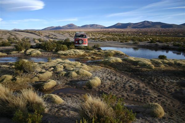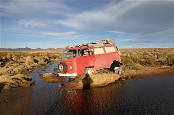 Wasser steht bereits im vorderen Fussraum. Abwechselnd betätigen wir das Gaspedal, sonst stirbt der Motor bei den niedrigen Drehzahlen ab. Wir schaufeln, schieben Büsche unter (was weder etwas an Traktion noch an Auftrieb bringt), versuchen den Fluss umzuleiten, trösten Elias, der mittlerweile den Ernst der Lage erfasst hat und verbringen hilflose Stunden im Eiswasser auf 4300 Metern Höhe, bis endlich die ersten Geländewagen auftauchen. Tourgruppen steigen eiligst aus, Kameras klicken. Nie war es unerotischer in einem VW-Bus zu sitzen. Zu einem Interview war ich diesmal nicht bereit. Nach fast einer Stunde gelingt es dem vierten Geländewagen uns herauszuziehen - auch sie haben auf dieser Höhe Probleme mit der Leistung. Wir sind wieder frei. Hochmut kommt eben vor dem Fall. Ab hier kontrollieren wir wieder jedes Wasserloch auf dem Weg und sei es eine noch so kleine Pfütze....