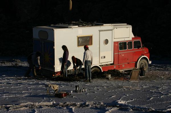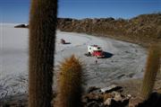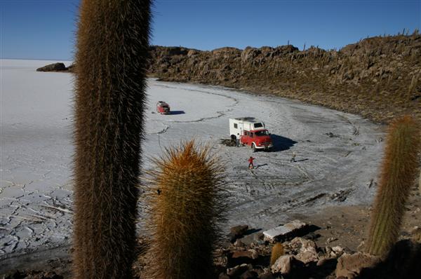 Nach 10 Tagen sind wir wieder in Uyuni und treffen dort Alex, David, Cosma und Jürgen. Ihr riesiges Mercedes Allradmobil gleicht gegenüber unserem Bus einer rollenden Dreizimmerwohnung mit Ofenheizung. Zusammen geht es noch einmal auf den Salzsee. Hier können wir dann zusehen, wie sich ein Allradfahrzeug eingräbt. Schaufeln bringt nicht viel, es werden zwei Sattelschlepper zum Herausziehen benötigt. Nach dem gemeinsamen Bergen erkunden wir noch eine Insel im Salz auf der 1200jährige Kakteen wachsen. Dann trennen sich unsere Wege. Schön war es - Gruss an Euch alle.