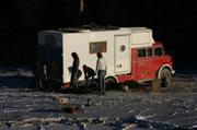 Trotz der eisigen Kälte von etwa -20 Grad (morgens früh um halb 8 sind es noch -15 Grad) bleiben wir zwei Nächte. Schweisskristalle bilden einen milchigen Vorhang auf der Innenseite der Fensterscheiben. Auf den Kissen sind die Träume der Nacht gefroren und der Bus ist sicher um einige Zehntelmillimeter geschrumpft. Der Anlasser inklusive dem Magnetschalter ist mittags noch festgefroren. Erst ein Feuerzeug und das Kurzschliessen mit einer Zange schaffen Abhilfe.