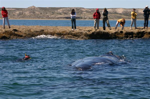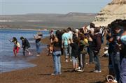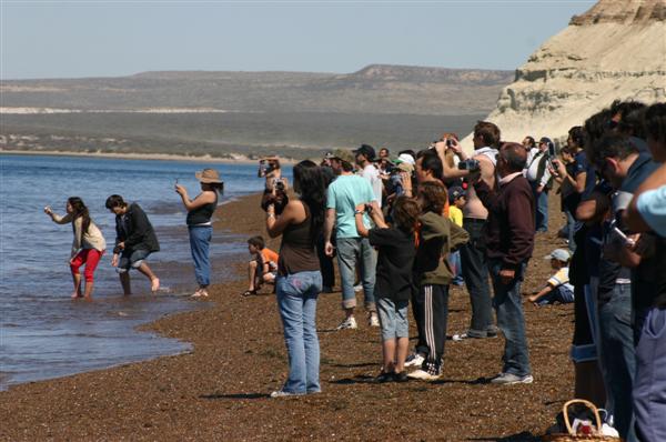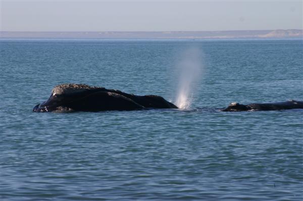 An manchen Tagen ist es windstill, dann ist besonders viel los. Wie zum Sonnenbaden drehen sich die Wale auf den Rücken und dümpeln vor sich hin. Andere schlagen immer wieder mit ihren Flossen gelangweilt und laut auf die Wasseroberfläche. Hier in der Bucht bei Puerto Madryn werden die Jungen geboren und gesäugt. 3,5 Zentimeter wachsen die Kleinen am Tag, mehr als unser vollgepackter Bus wiegt. Auch in der Nacht können wir das fauchende Ausblasen direkt an unserem Bus hören. Fast schon ein unheimlich, es erinnert uns ein wenig an den Film Jurassic-Park.