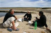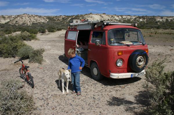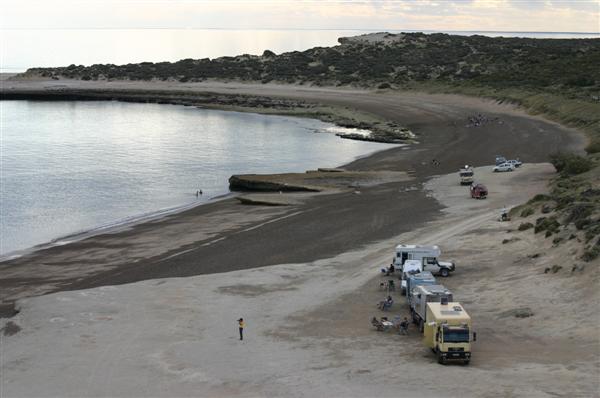Nach ein paar Tagen machen wir einen Ausflug nach Punta Pardelas auf der Halbinsel Valdes. Hier kann man auch frei am Strand stehen, das hat sich mittlerweile herumgesprochen. Neben riesigen Action-Mobilen, so teuer wie ein Einfamilienhaus, wirkt unser rostiger Bus ein wenig deplaziert.
